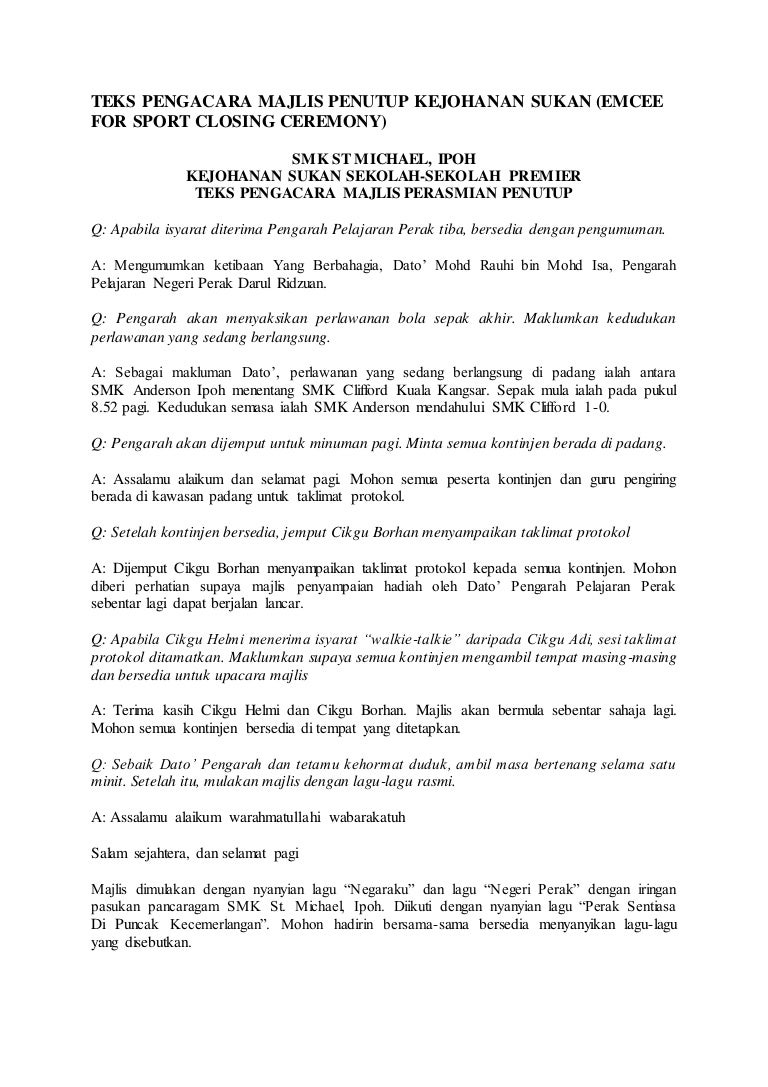 Use the download button below or simple online reader. Keputusan keseluruhan kejohanan bola keranjang mss 2017 peringkat negeri sabah tampat ;sjkc kung ming beaufort tarikh ; Alhamdulillah kita telah selesai melaksanakan semua acara sukan pada kejohanan balapan dan padang tahun ini. Timbalan naib canselor (hal ehwal pelajar dan alumni) wakil rasmi naib canselor, universiti tun hussein onn malaysia (uthm). Ucapan sambutan 1malaysia teks ucapan 1 malaysia. Sebagai ucapan selamat datang kepada bapak/ibu sekalian. Kepada atlet yang berjaya tahniah diucapkan dan kepada yang tidak berjaya tahun hadapan cuba lagi. Teks doa untuk pengantin baru. Teks pengacara majlis penutup kejohanan sukan slideshare net. 0%0% found this document useful, mark this document as useful. Teks pengacara majlis penutup kejoh. Teks ucapan 2021 induction programme for judicial commissioners 29 march 2021, opening remarks by tun tengku maimun binti tuan mat, the chief justice of malaysia. Nasional mac 17, 2021 @ 2:52pm.